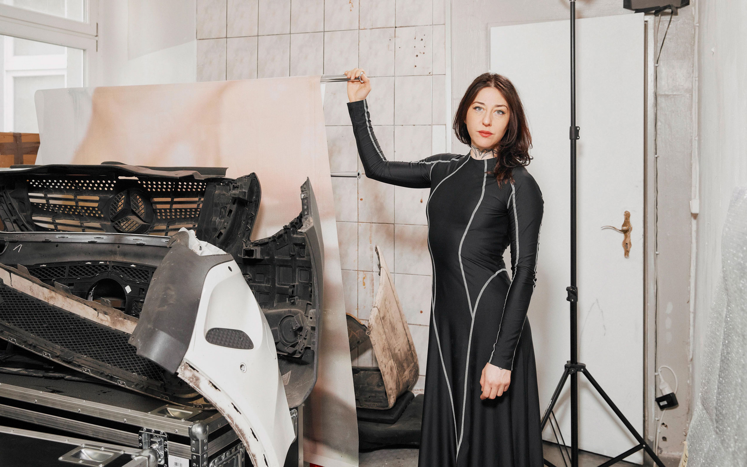 I have a group of people that I work with regularly. Some of them are professional dancers, but the rest are amateur performers. I really like how this adds a different layer to my work. The first piece I ever made with other people was CLICHE in 2023. It was about the stereotypes Germans have about Turkish men and their cars. I invited Candas Bas, a dancer who is now working with Constanza Macras’ company Dorky Park, to take part. Then, the week before the performance, the earthquake in Turkey happened. Candas, who is also from Turkey, told me that she was devastated and could not do the show. I totally understood. At the same time, I got very sick with a fever. I lost my voice for a week and didn’t have any time to rehearse. So, I called up a friend, my personal trainer Daniel Schabert, an ex-lover named Robin, as well as Nomi Sladko whom I’d met the week before at Trauma Bar und Kino, an arts and club culture space here in Berlin. They jumped in at the last minute and the work was very fragmented as a result. Each of the performers had their own stations. I tied Robin, who’s a lawyer, to a Mercedes, as reference to Chris Burden’s 1974 performance Trans-Fixed (in the original, his lawyer fixes Burden to the car). Choreographer Emeka Ene played a distorted guitar version of Rihanna’s Shut up and Drive, Ahmet Ögüt was interviewed about his immigration on top of the car, my personal trainer skipped repeatedly on top of a pile of flour, and Nomi and I did a Grand Theft Auto-inspired lap dance. It was an assemblage of hyper cliches.