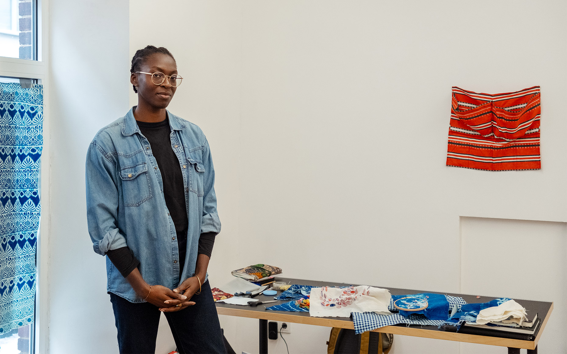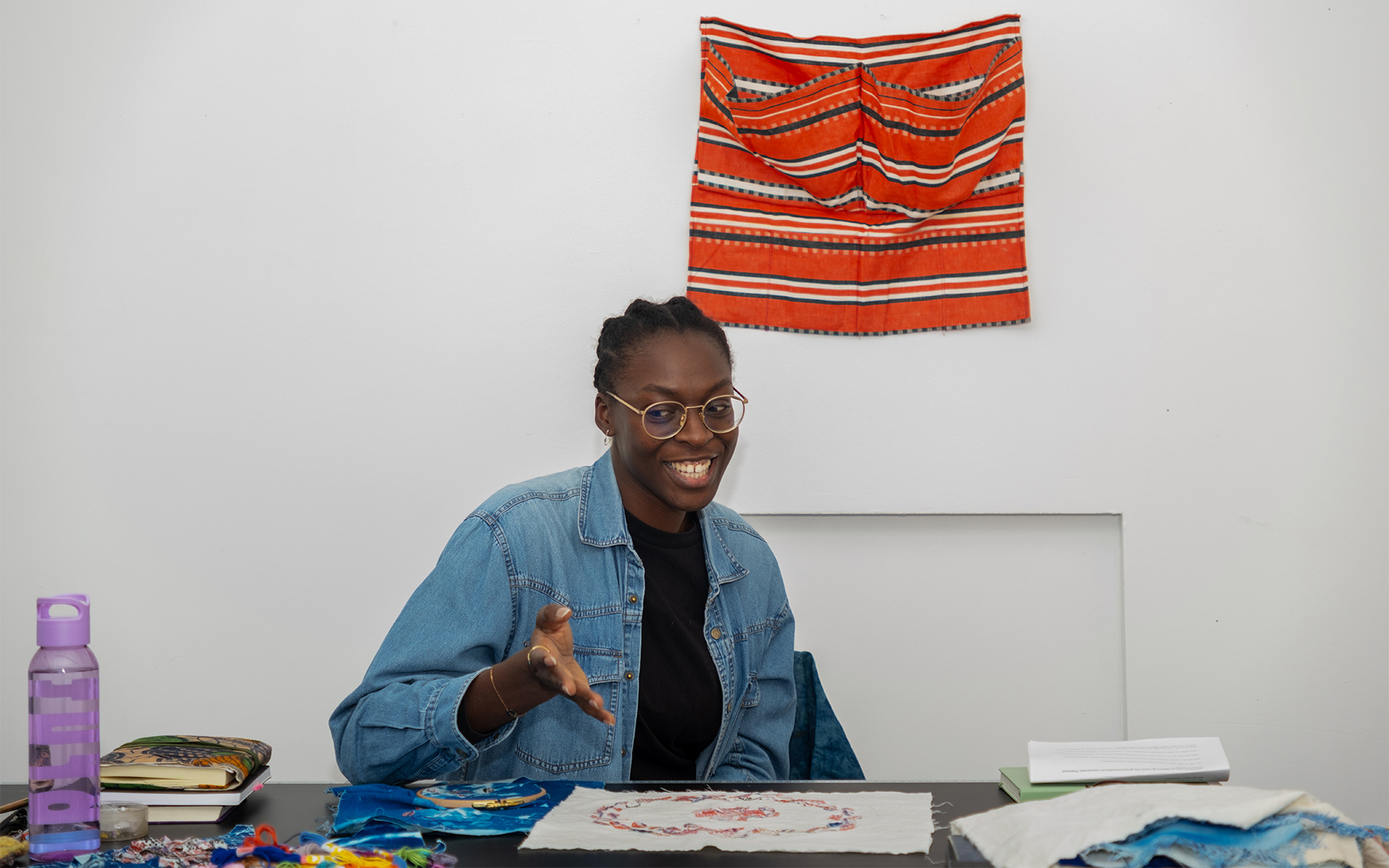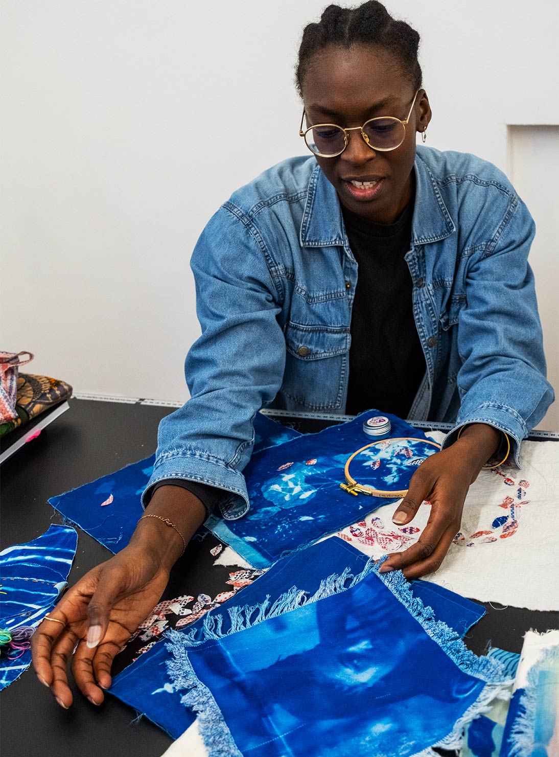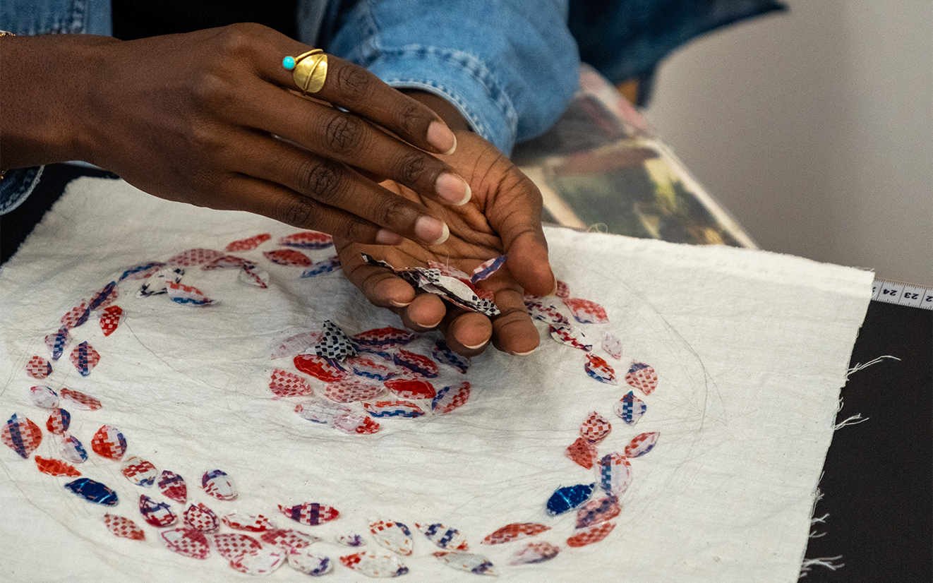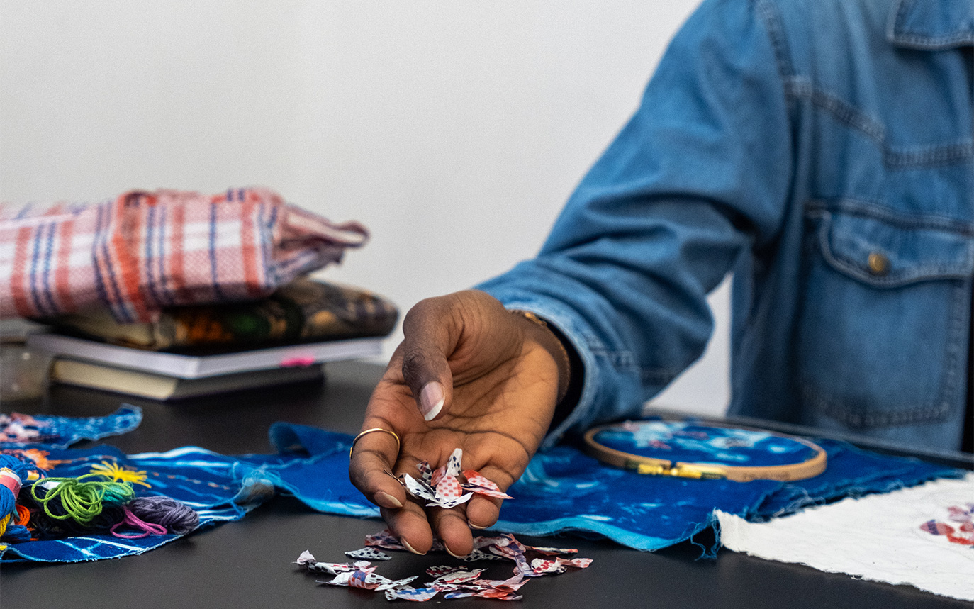 Der Plan kommt manchmal erst, wenn ich schon im Machen bin. Ich habe ein paar Tools und Techniken, mit denen ich arbeite, dann kommt die Idee. Es ist ein fließender Übergang. Zurzeit besticke ich Cyanotypien meines Fußsohlenabdrucks mit bunten Fäden und „ghana-must-go“ cut outs. Ich weiß nicht immer, was ich mache, aber in diesen meditativen Zustand einzutauchen, bringt die Ideen hervor.