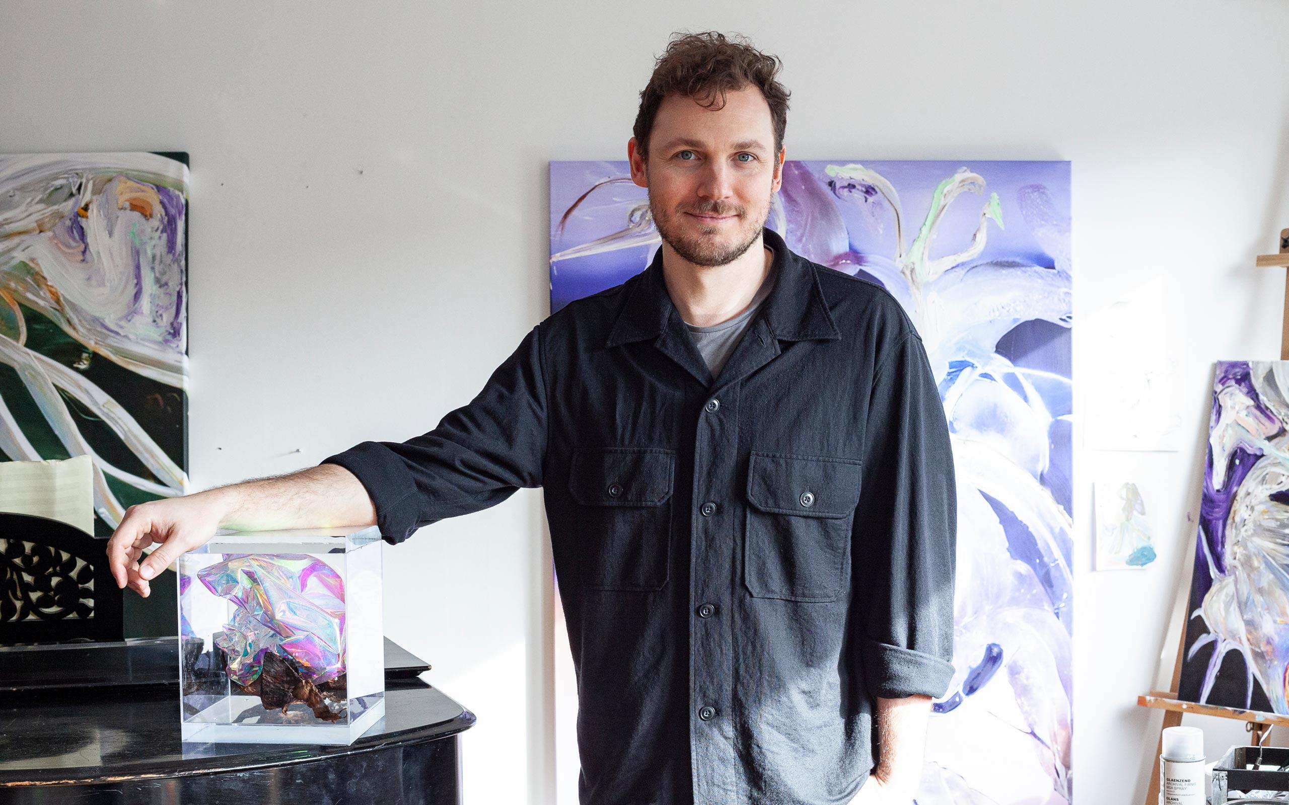 Ich musste alle meine Studiengebühren selbst finanzieren. Außerdem hatte ich noch eine Menge Schulden aus meinem früheren Studium, sodass ich nicht einfach einen weiteren Kredit aufnehmen konnte. Und es war für mich schwierig, einen Job zu haben und gleichzeitig ein Vollzeitstudium zu absolvieren. Deshalb habe ich während des Studiums angefangen, meine Werke zu verkaufen, und heimlich als Künstler gearbeitet. Das war nichts, was ich meinen Professoren gegenüber bekannt machen wollte. Als ich mit der Kunstschule fertig war, hatte ich bereits eine Galerievertretung und mehrere kleinere Ausstellungen. Manche Künstler sprechen von der Leere zwischen der Kunstschule und der professionellen Arbeit als Künstler, aber ich hatte großes Glück, dass ich in gewisser Weise eine weiche Landung hatte. Allerdings schloss ich mein Studium gerade ab, als die weltweite Pandemie begann. Ich musste mir überlegen, wie ich meine künstlerische Tätigkeit aufrechterhalten und meine Vision von zwei Ateliers verwirklichen konnte: eins in Amsterdam und eins in Kopenhagen.