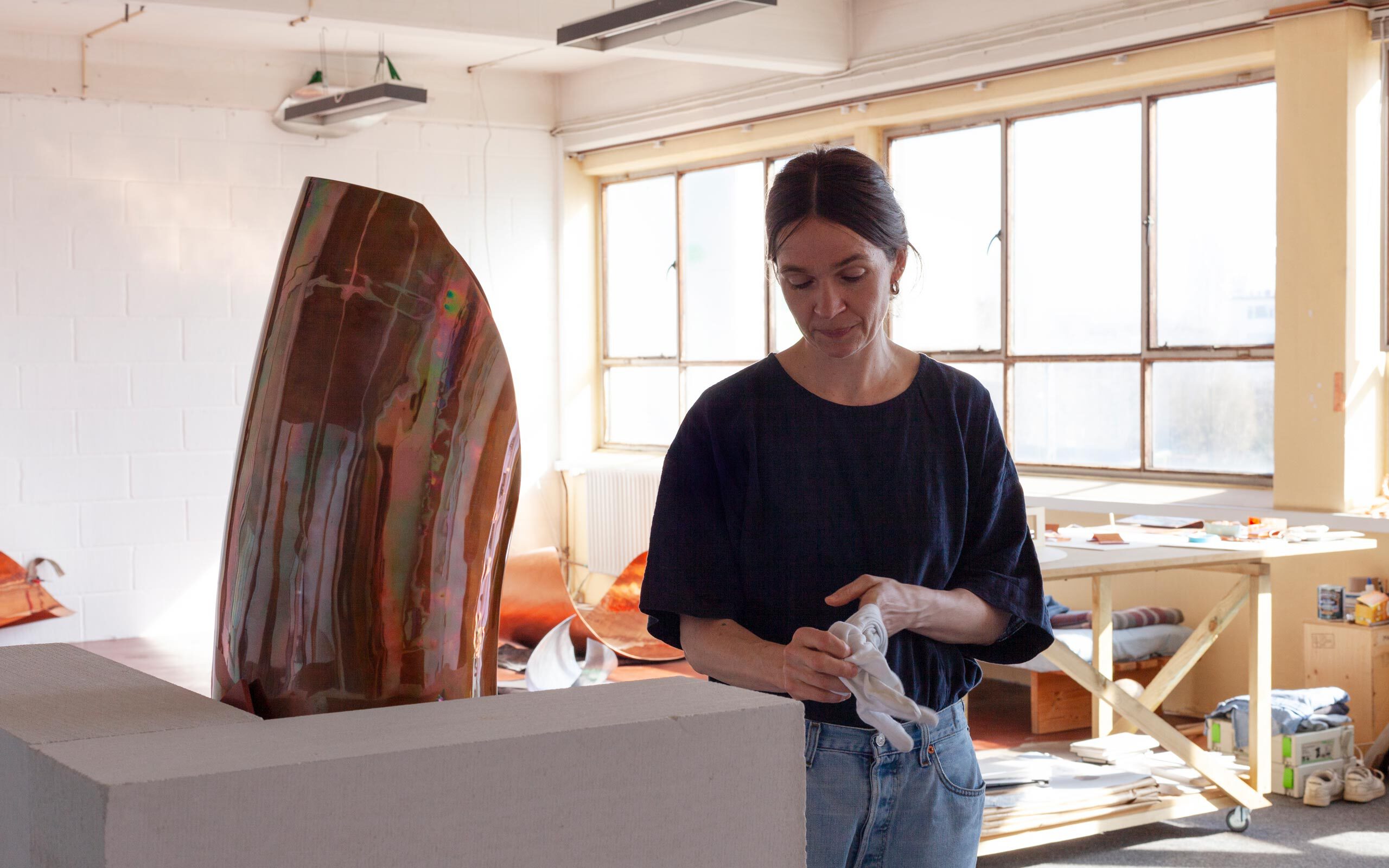 Die Formung des Materials geschieht in der Verhandlung zwischen den Eigenschaften des Materials und der Absicht, die ich verfolge. Bei der Formgebung von Kupfer erforsche ich zum Beispiel seine Stärke und Flexibilität, indem ich es erhitze, hämmere, dehne und stauche. Ich habe mit einem sogenannten English Wheel gearbeitet, das traditionell zur Herstellung von Oldtimerteilen verwendet wird. Dabei handelt es sich um ein mechanisches Verfahren, bei dem man zwei Räder spannt, die viel Druck ausüben, wenn man das Kupfer zwischen ihnen rollt. Durch diese sich wiederholende Bewegung in Verbindung mit dem Druck kann man das Kupfer dehnen und formen. Ich genieße die Körperlichkeit als unmittelbare Begegnung und als Konsequenz daraus, dass ich mir etwas ausdenke, das Material bearbeiten muss, dass ich die Zeit dafür aufbringe und mich damit beschäftige.
