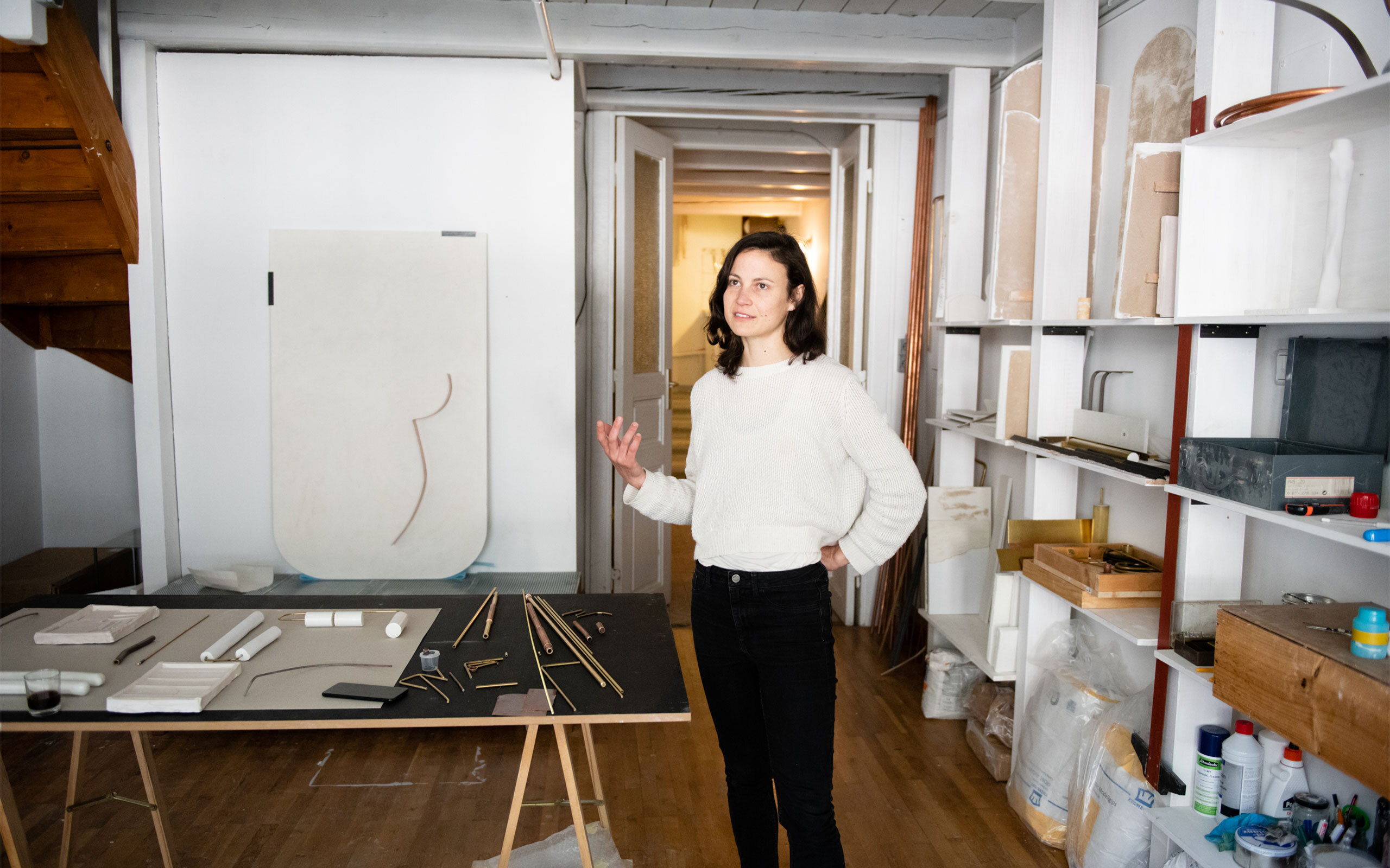 Genau. Ich sitze hier und arbeite teilweise an sehr kleinteiligen Dingen. Alles, was hier an bearbeitetem Material liegt, das sind für mich bereits skulpturale Objekte, ob es jetzt nur gebogen, brüniert oder geschliffen ist oder schon konkretere Form oder eine Verbindung aus zwei verschiedenen Materialien. Aber es sind trotzdem in gewisser Weise Einzelteile, Fragmente, die ich dann wieder zu einem Gesamten zusammensetze. Ich beschäftige ich mich viel damit, zu bestimmen: Ab wann ist eine Arbeit sozusagen schon genug? Und wieso ist sie das? Für welches Teil ergibt es sich doch wieder, dass es sich in ein größeres Ganzes einfügt und Teil eines installativen Settings wird? Grundsätzlich arbeite ich sehr prozesshaft. Bei all diesen Stücken, die hier liegen, gehe ich davon aus, dass sie potenziell Einzelteile eines Ganzen sind. Diese zwei Gipsgüsse hier zum Beispiel gibt es schon über ein Jahr, und ich versuche, sie in Settings einzubauen. Hartnäckigst oder gelassen, je nachdem, aber nichts funktioniert für mich. Und dann komme ich an den Punkt zu sagen: Okay, vielleicht sind sie schon genug, so wie sie sind. Nur dann kommt wieder die Präsentationsform dazu, mit der ich mich auch viel beschäftige: Die Dinge sind ja, wenn sie im Atelier liegen, kein fertiges Bild oder eine fertige Skulptur. Manche Settings entstehen im Ausstellungskontext aus diesen Einzelteilen und die Präsentationsform bringt meist wieder die Kombination mit einem anderen Material mit sich. Der Raum als ultimatives Trägermaterial spielt im Endeffekt dann auch eine Rolle.