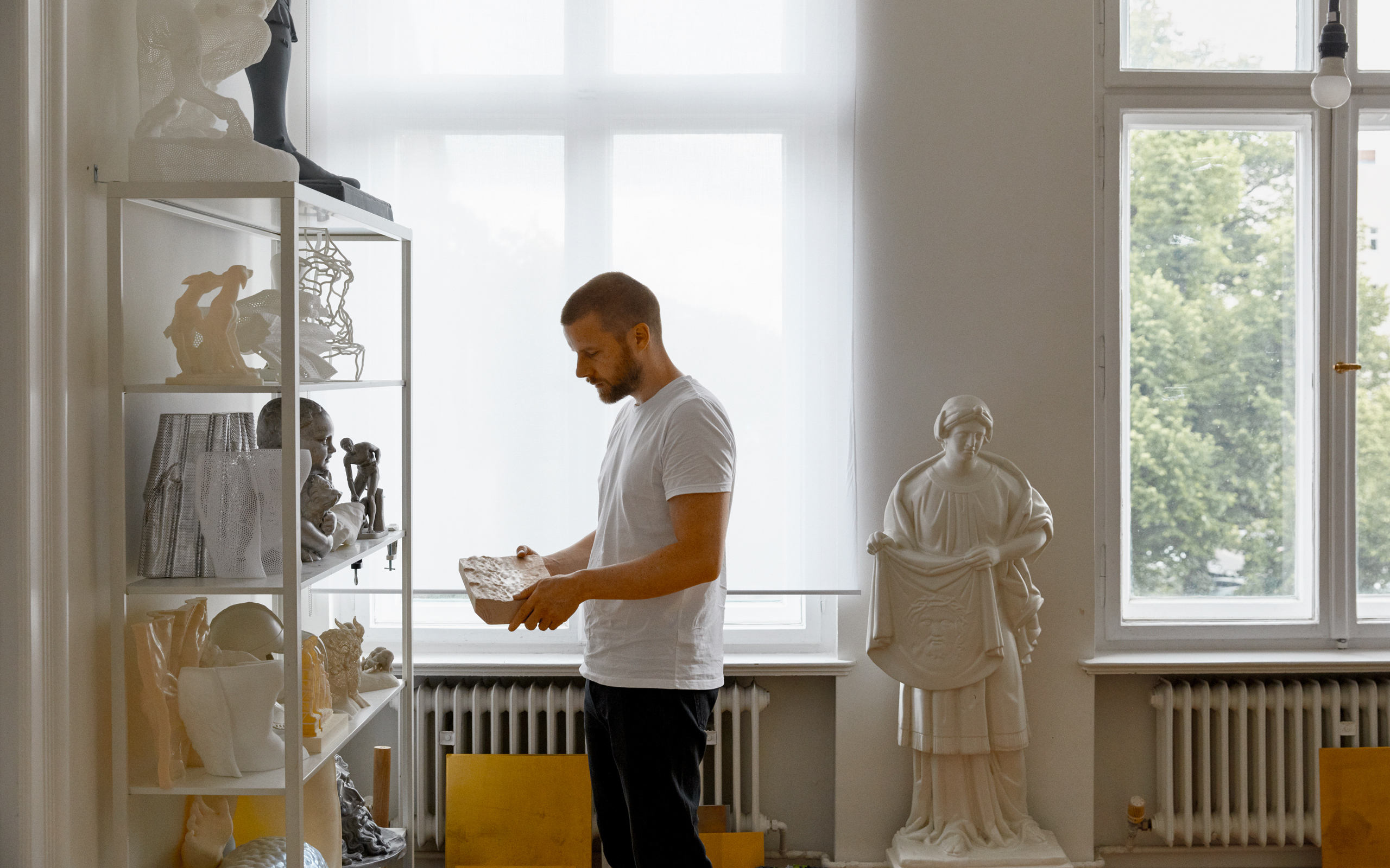 Bei meinen Skulpturen fängt es oft mit einem 3D-Scan an. Der rohe Scan wird modifiziert und adaptiert. Dann segmentiere ich in einzelne Elemente je nach Limitation des Bauraums der Drucker. Diese „Bauraum-Limitation” hat sich mit der Zeit als Möglichkeit erwiesen. So versuche ich in technischen Restriktionen ein produktives Potenzial zu finden. Die Formen der einzelnen Segmente werden dann noch vor dem Druck digital transformiert. Ich arbeite gerade an einem Buch für das Ferdinandeum in Innsbruck, in dem ein Teil dieser Prozesse als Tutorials kommuniziert wird. Ich arbeite meist seriell und nutze die verschiedenen Stadien einer Serie als Chance für weitere Versuche. Falls eine Skulptur beschädigt oder zerstört wird, restauriere ich lieber nach meinen aktuellen Kenntnissen und Möglichkeiten, als historisch strikt zu reproduzieren. Es hilft meiner Herangehensweise sehr, wenn eine Skulptur adaptiv und wandelbar ist.