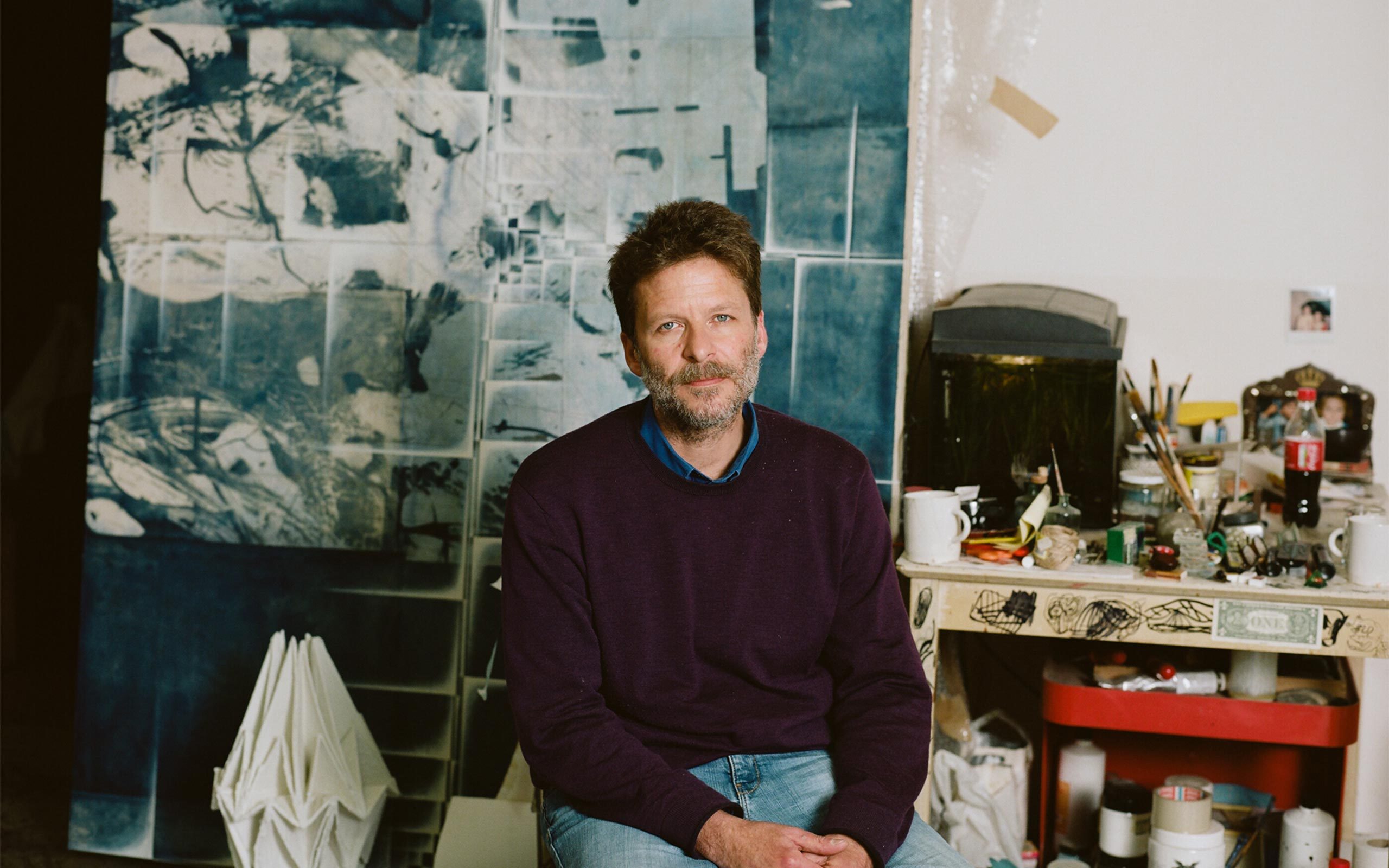 Die Fotobilder habe ich nicht geplant, sie haben sich im Laufe der Zeit ergeben. Diese Entwicklung gefällt mir, und ich finde sie auch insofern interessant, da ich eigentlich ein Maler bin. Meine Entwicklung ging von der Malerei zur Collage. In einer früheren Phase habe ich viel mit Siebdruck gearbeitet, immer ergänzt mit Malerei. Als diese Technik für mich ausgereizt war, habe ich mich den Fotogrammen zugewandt, auch in Form von Cyanotypien, einem alten fotografischen Verfahren. Die belichteten Partien erscheinen im für die Technik typischen Blauton. Man mischt zwei Chemikalien, die in einem bestimmten Verhältnis mit Wasser verdünnt sind, in der Dunkelkammer zusammen, dadurch werden sie lichtaktiv. Dann bringe ich die Flüssigkeit auf Papier auf, um dieses im Anschluss an der Sonne zu belichten. Das Ergebnis ist ein Fotogramm, das im Unterschied zum Foto in Direktbelichtung ohne Linse aufgenommen wird. Daneben mache ich auch Fotogramme auf Basis von Silbergelatine, also in Schwarz-Weiß.