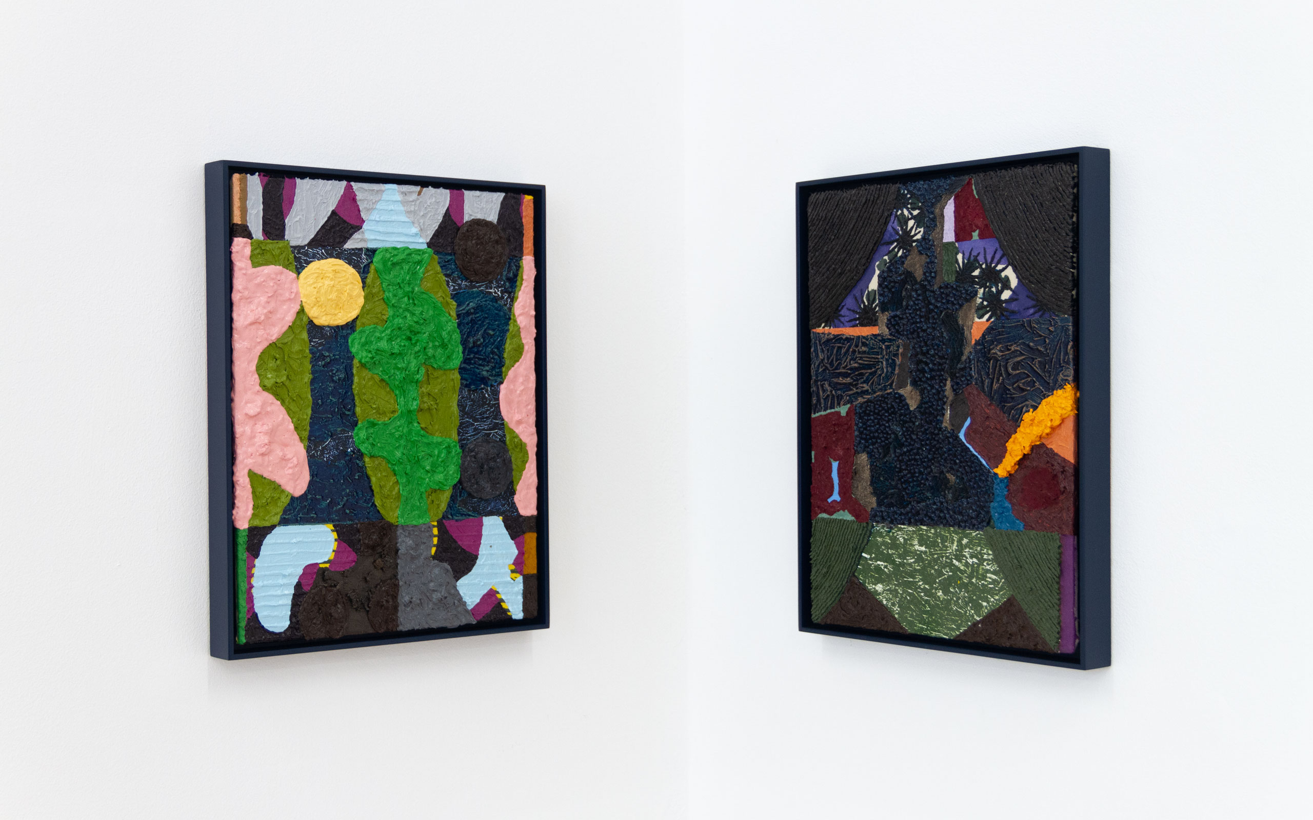 For Collectors Agenda, Freund has developed the series Skulptur im Park (2025). The ten oil and collage works on wood (each 40 × 30 cm) build on an earlier series while shifting the focus more strongly to tactile qualities. Thickly applied paint, relief-like surfaces, and collaged fabrics produce images that, depending on the light, take on the quality of dioramas. Rather than centering on a single figure, the works present layered constellations of abstract objects and situations brought into relation within an imagined park.
