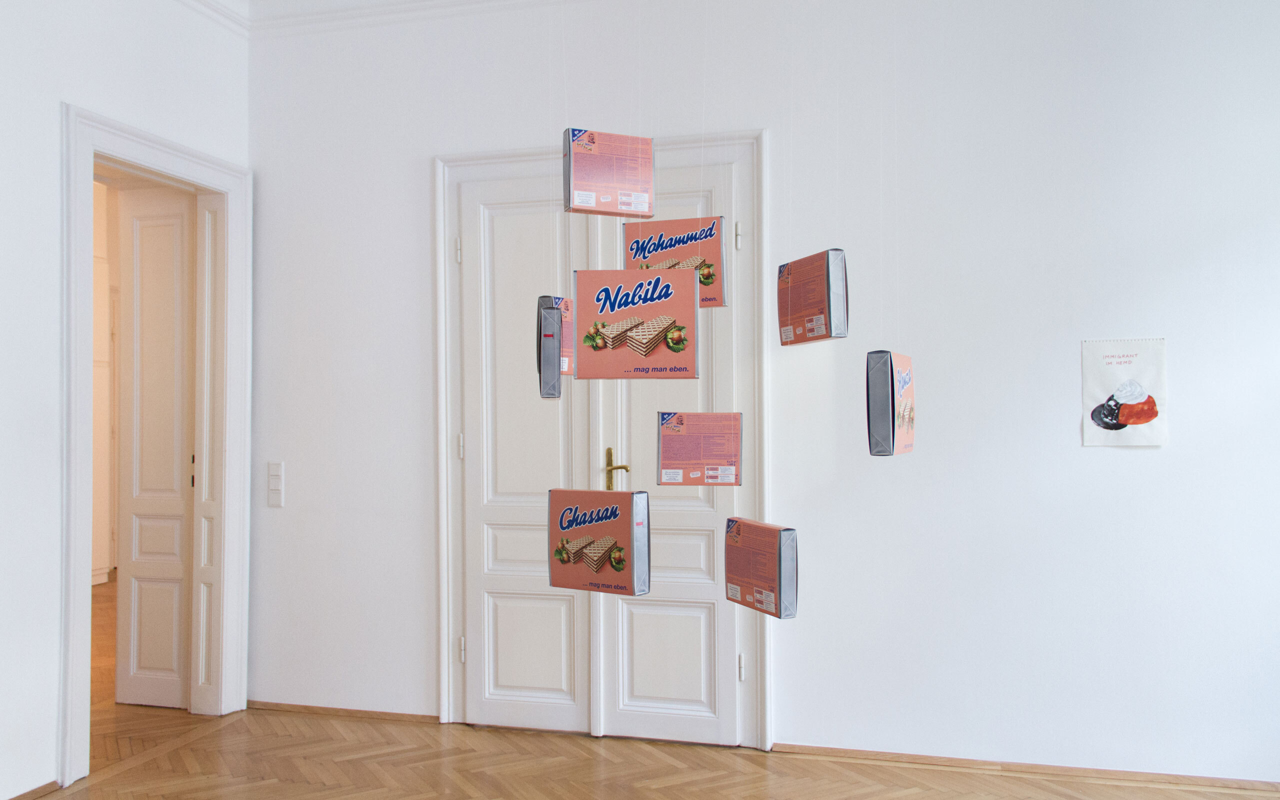 The center piece of the exhibition, My Austrian Friends, appropriates the principle of personalization that is currently employed by many consumer brands worldwide. When an Austrian friend of the artist wanted to personalize the packaging of waffles by the popular Austrian Manner brand, he was unable to select any of his Arab friends’ names. It was only on special request that Manner’s customer service agreed to produce the waffles with his friends’ names written on, which, quite apparently, were considered outside the norm.