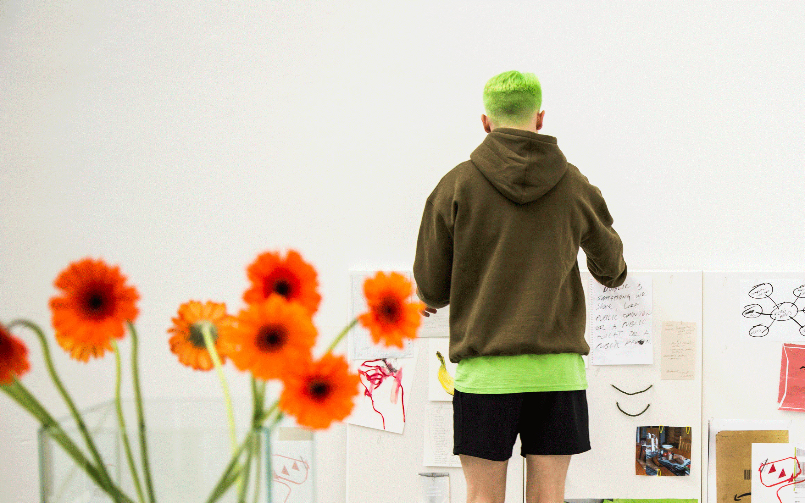 My bodily project is a performance, which I use as a platform to create art. In that I put myself through everyday transformations of masculinity, like bodybuilding, diet, language, and dress. My art works mix the everyday life, all the stuff that’s going on in it, and myself as a queer person, into a series of works that try to present a version of the world we live in. I shape things into videos, photographs, sculptures, and installations. My performative processes often happen in places where it is not necessarily viewed as art by the audience, when I’m working out, when I’m eating, browsing social media, riding a bike. The everyday world in which I live, is shaped artistically by the things with which I’ve chosen to surround myself