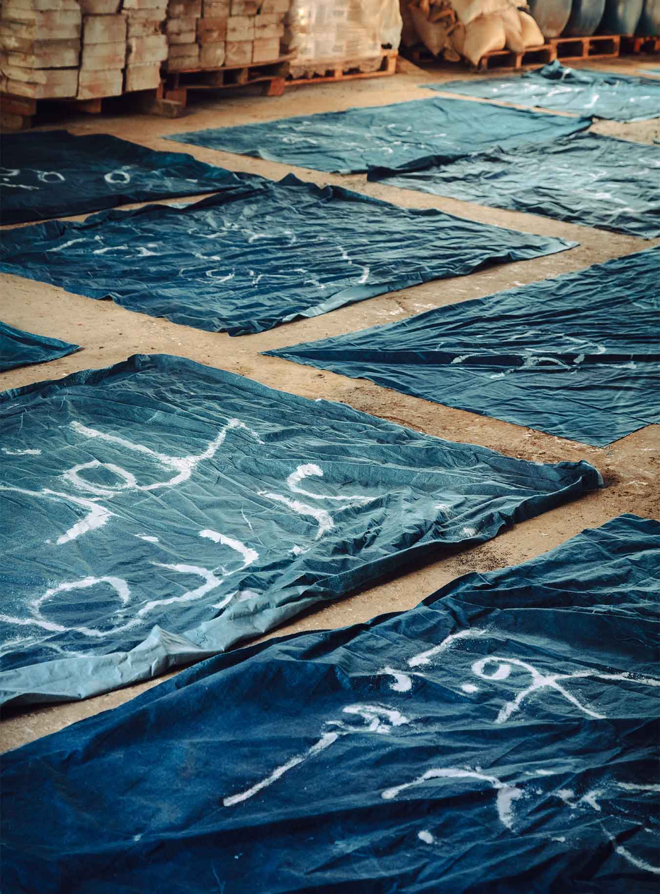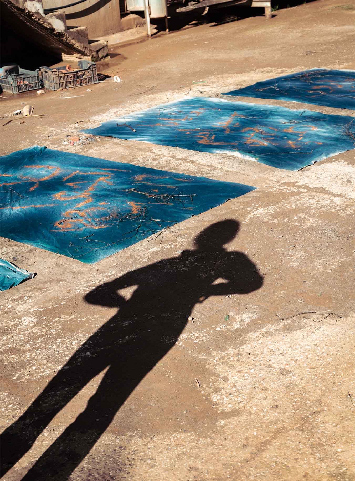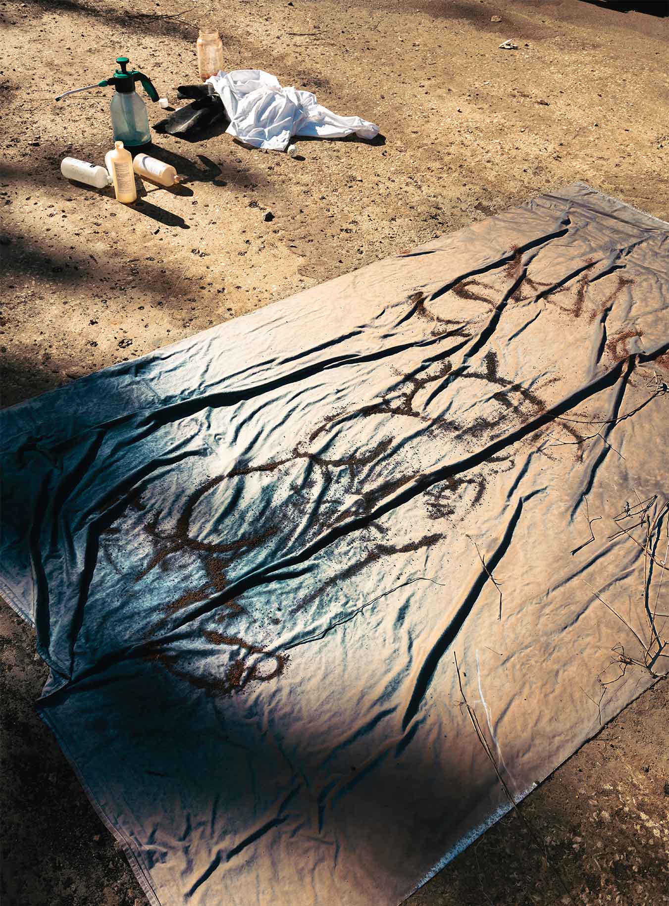 The production stage is really quite physical. Every time I have to take care of my body and prepare for the visits because it puts a lot of strain on me, I’ve broken my foot while working, I’ve hurt my shoulder to the point that I could not grip anymore, the scale and the process are so commanding. Essentially, my whole body becomes like a paintbrush or a tool to depict the marks. Given the nature of the work, I can’t really say I have a studio. My studio changes based on locations, and every piece is different. For Adonis River, it was a hike, but for example, for the work at Kunsthalle Basel, Xíloma. MCCCLXXXVI, the site was inaccessible. Once I realized I couldn’t’t go, I had to think of another way of depicting it. I ended up using the sun as material and made cyanotypes, especially because that body of work deals more with imagery rather than just location.