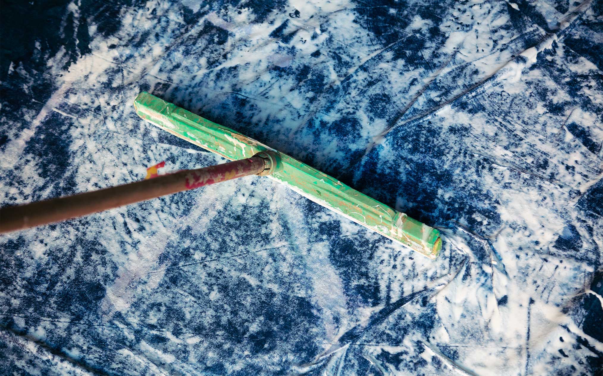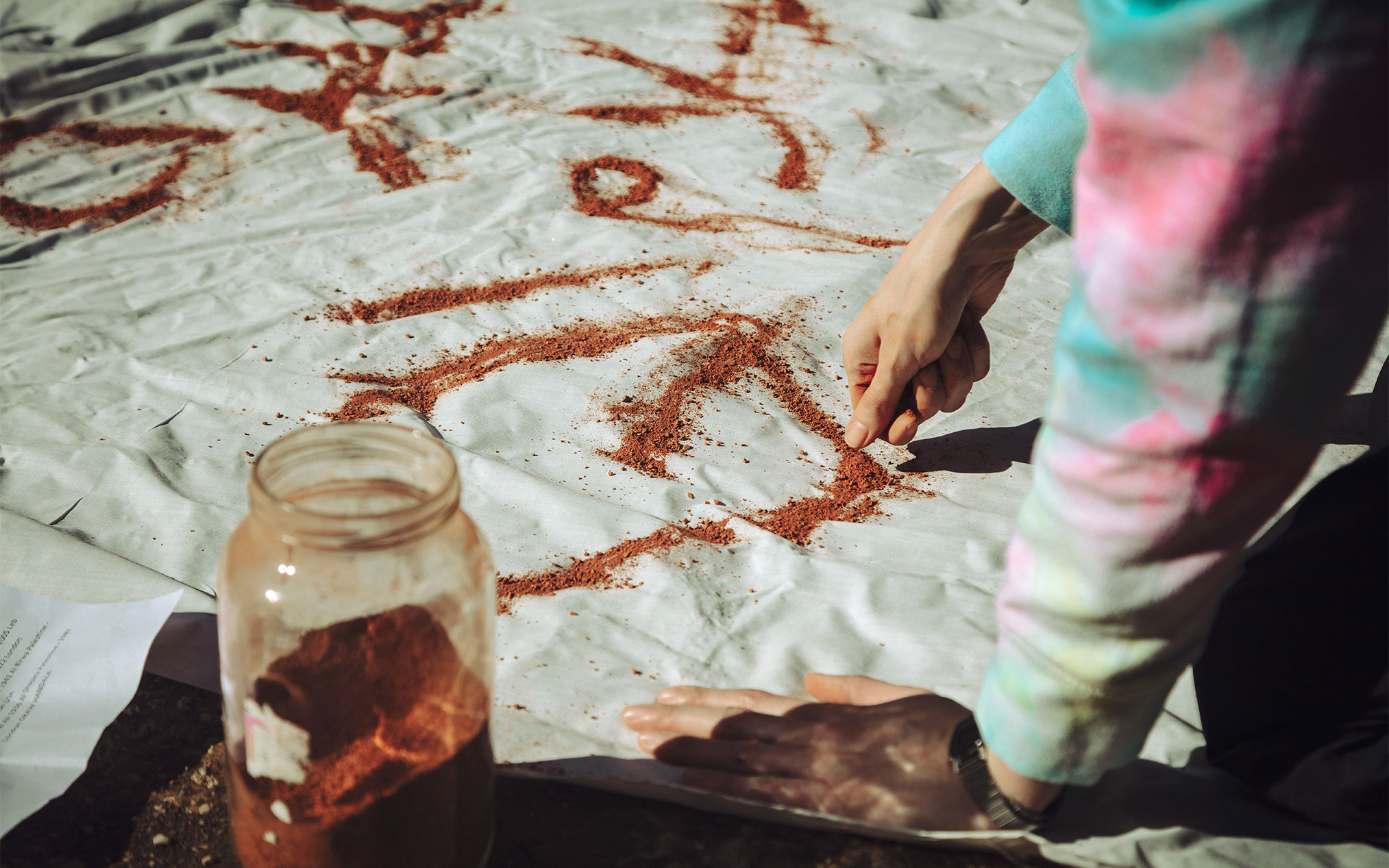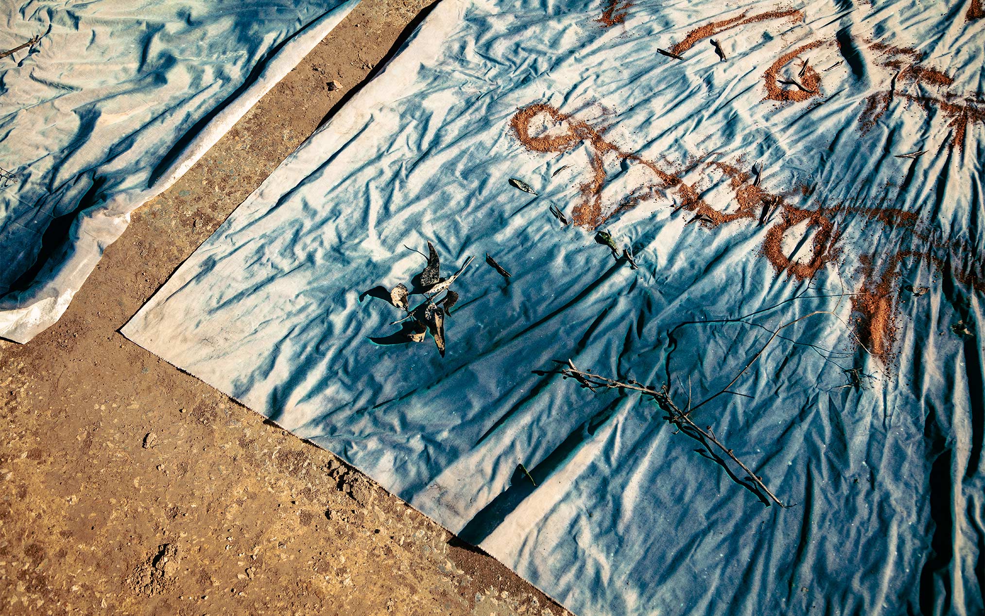 The production stage is really quite physical. Every time I have to take care of my body and prepare for the visits because it puts a lot of strain on me, I’ve broken my foot while working, I’ve hurt my shoulder to the point that I could not grip anymore, the scale and the process are so commanding. Essentially, my whole body becomes like a paintbrush or a tool to depict the marks. Given the nature of the work, I can’t really say I have a studio. My studio changes based on locations, and every piece is different. For Adonis River, it was a hike, but for example, for the work at Kunsthalle Basel, Xíloma. MCCCLXXXVI, the site was inaccessible. Once I realized I couldn’t’t go, I had to think of another way of depicting it. I ended up using the sun as material and made cyanotypes, especially because that body of work deals more with imagery rather than just location.