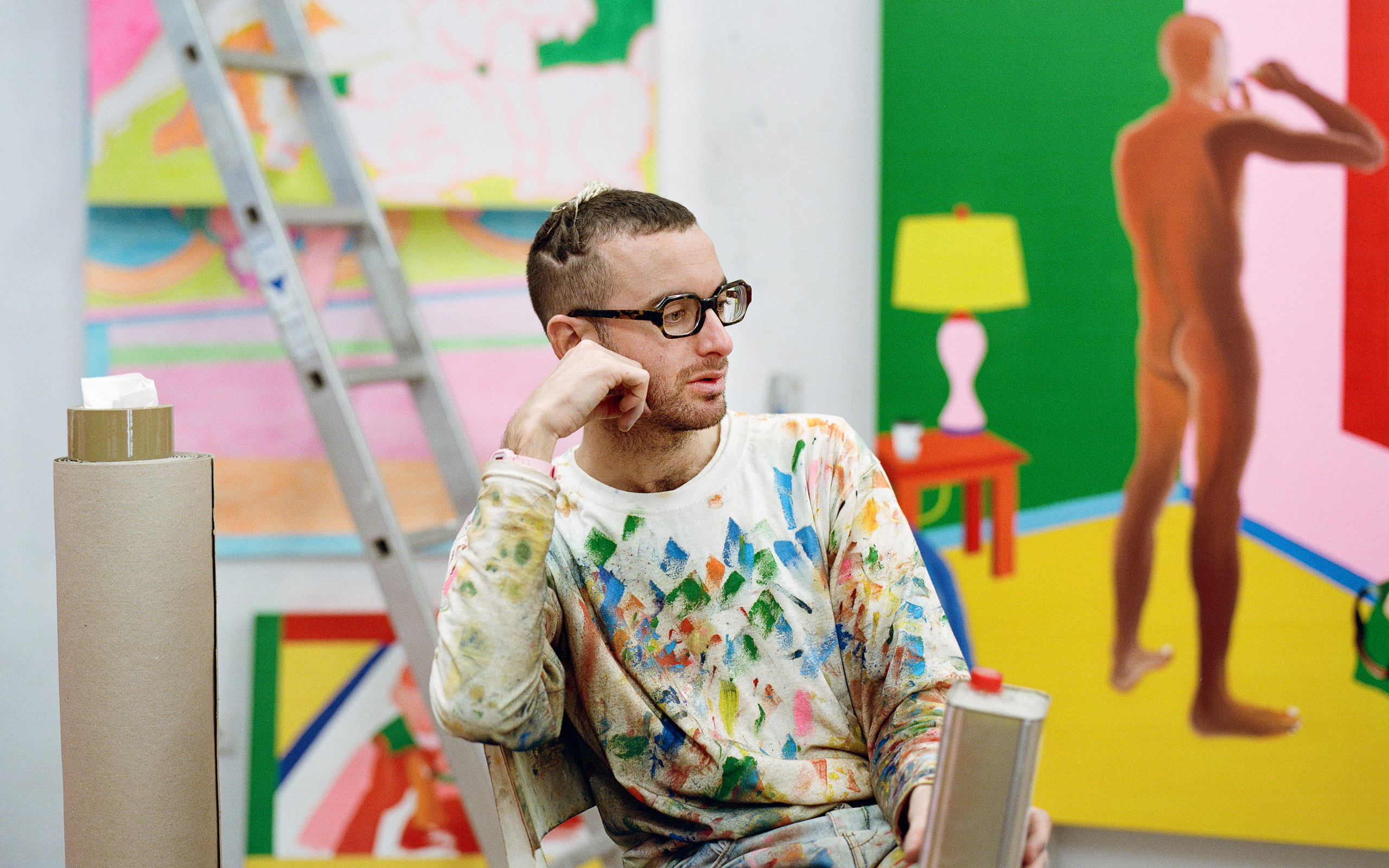 I grew up in a religious settlement, a sort of rural village oriented toward an agricultural lifestyle where people live together as a community. I was not asked whether I wanted to be born into that place, but I grew up there and it is one of the core foundations of who I am. When people hear that’s where I come from, the association that comes to their mind is not of the most liberal and tolerant place. However, my parents are incredibly tolerant and liberal, and it was important for them to show us the world. As a child to a mother from New York and a father from Algeria I was exposed at a young age to a variety of places that very much influenced me. The melting pot of identities and cultures is an integral part of who I am. Being a foreigner in Germany also meant that I have a foreign eye, and that was rejuvenating for me both as an individual and as an artist. In my paintings, I incorporate religious references from my past in Israel, as well as gay references from my life in Berlin. Gradually, I started combining both types of imagery. From day one in art school, my work was colorful. I remember that when I just began studying, I was fascinated by ancient Greek sculpture. I would re-draw the powerful male archetypal Greek figures but add on peyes to them (i.e., sidelocks worn by men and boys in the Orthodox Jewish community).