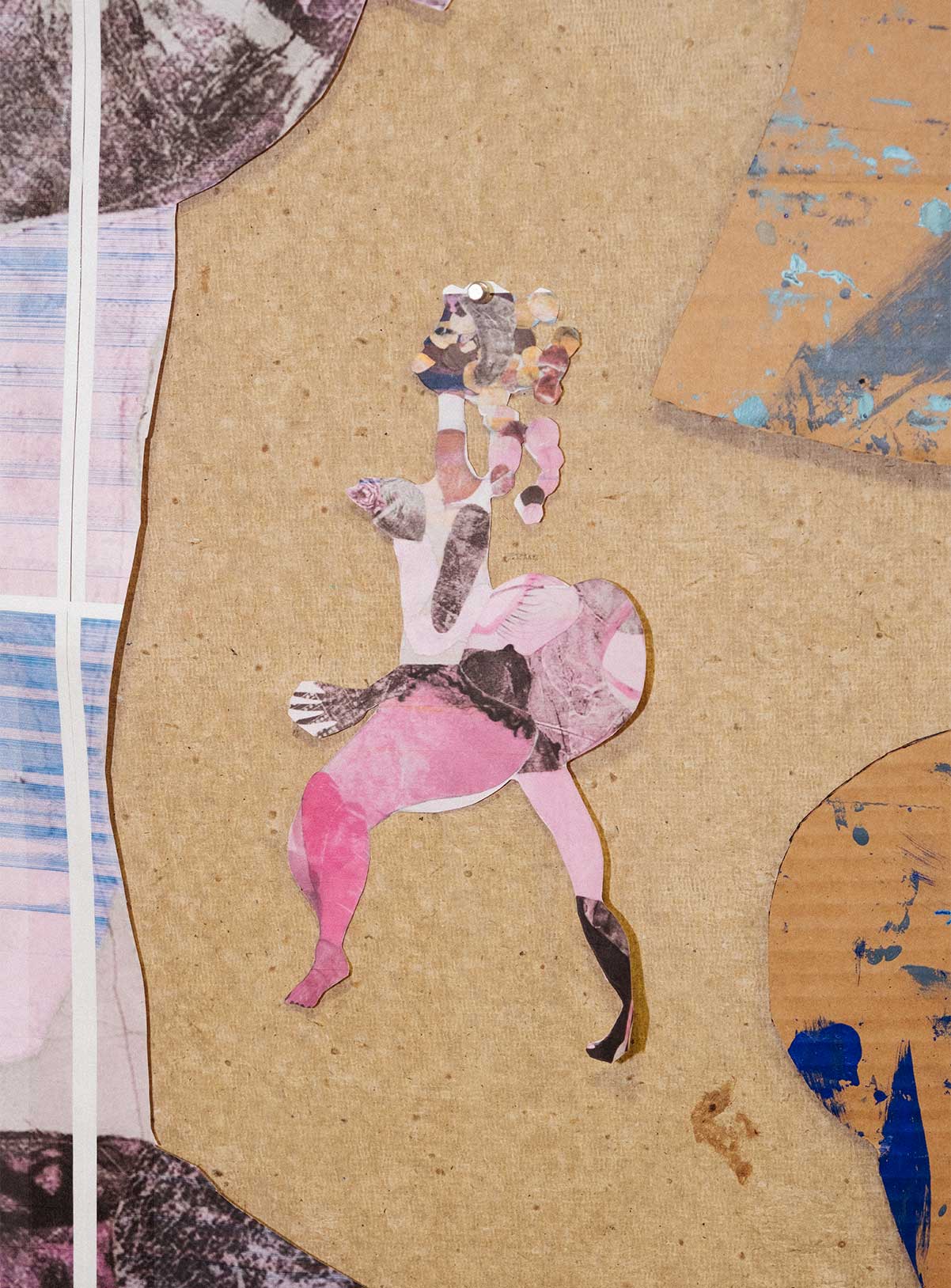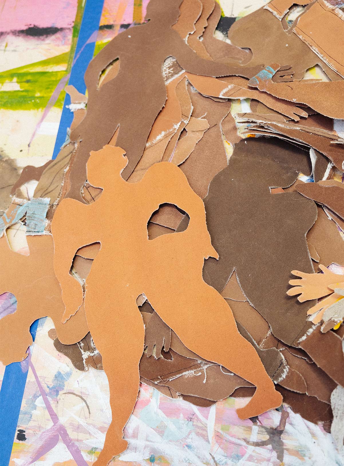 A lot of the time, I start with one part of the body, often the face. That part becomes the anchor for the figure. Because I’m working in collage, it’s a physical object: a piece of fabric, an appliqué element I’ve fashioned with a sewing machine. From that point, I begin to build the rest of the form. As the figure takes shape, the narrative around them generally starts to emerge. As their body is composed, I begin to imagine who they are, what they’re experiencing, and where they are, based on their gesture, shape, and pose. Sometimes they exist in liminal environments — not in a physical space, but in a mental or emotional state. The work develops in real time alongside this emerging narrative. Once the figure is composed, I start considering how they will exist on the picture plane. Then all the elements are sewn down and fixed to a larger canvas, which becomes the ultimate substrate for the painting. Once the canvas is stretched, I start painting, which is the second phase of world-building around the figure.